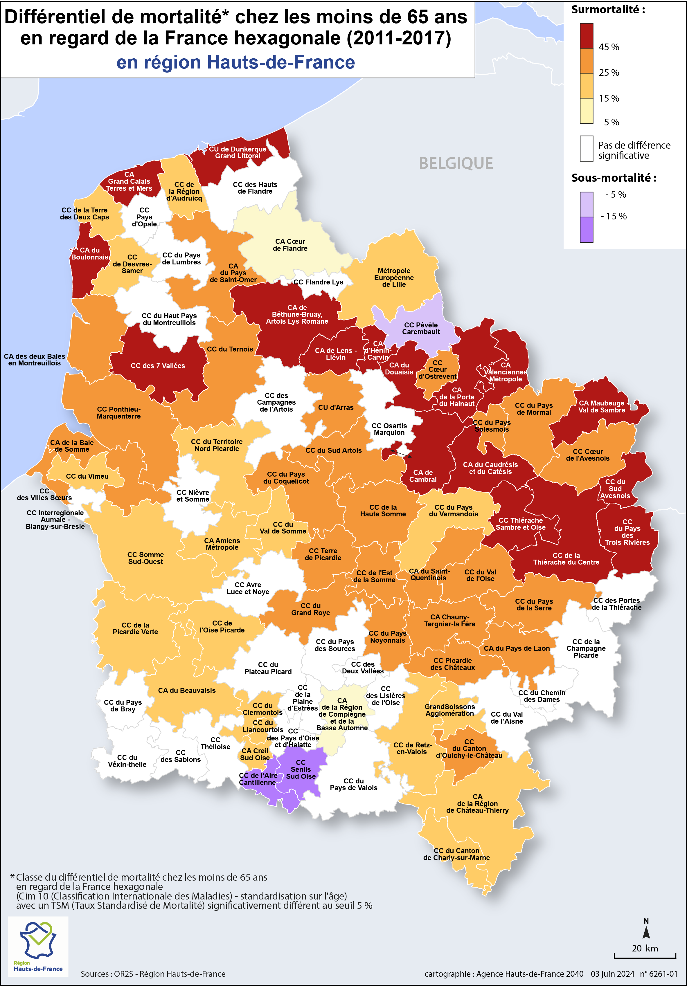 La carte représente ce différentiel pour la Région Hauts-de-France (par EPCI) à l'aide de 7 classes.