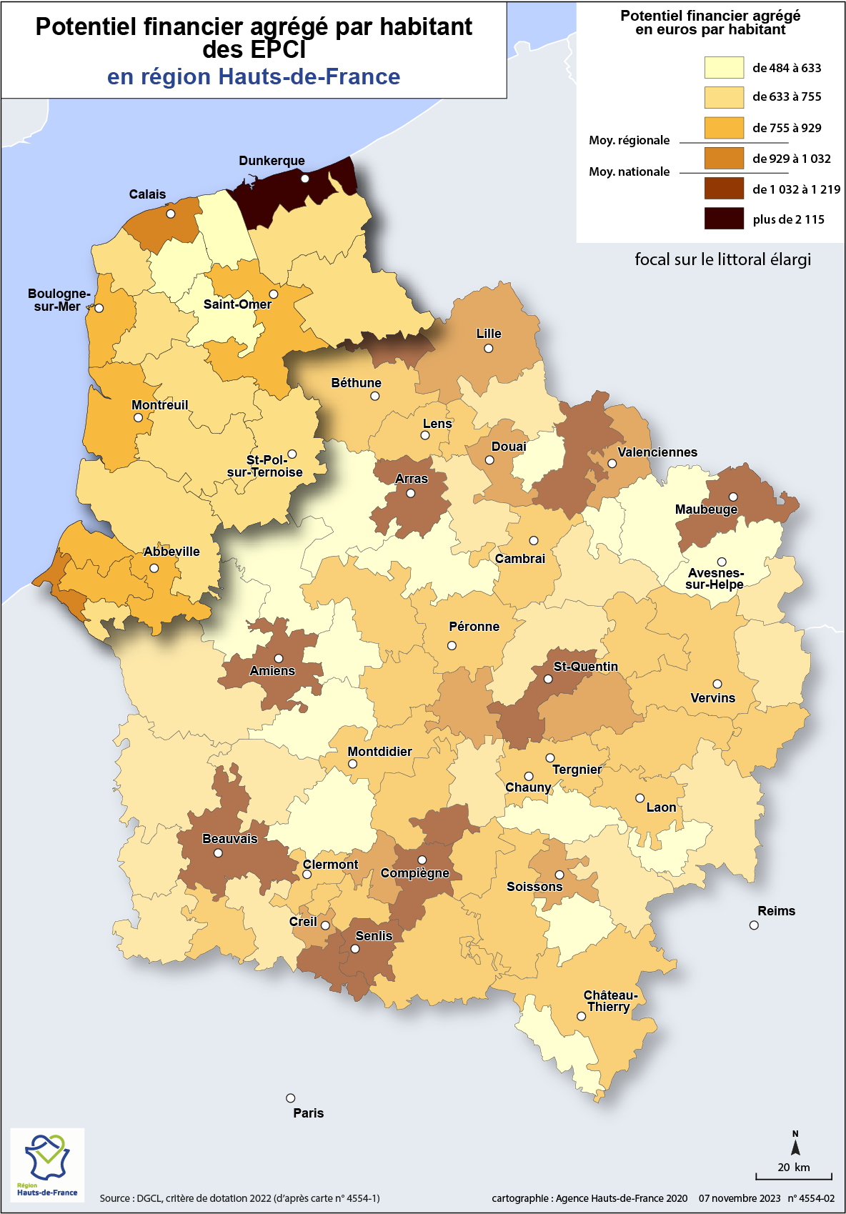 La carte met en évidence le potentiel financier agrégé par habitant des EPCI
