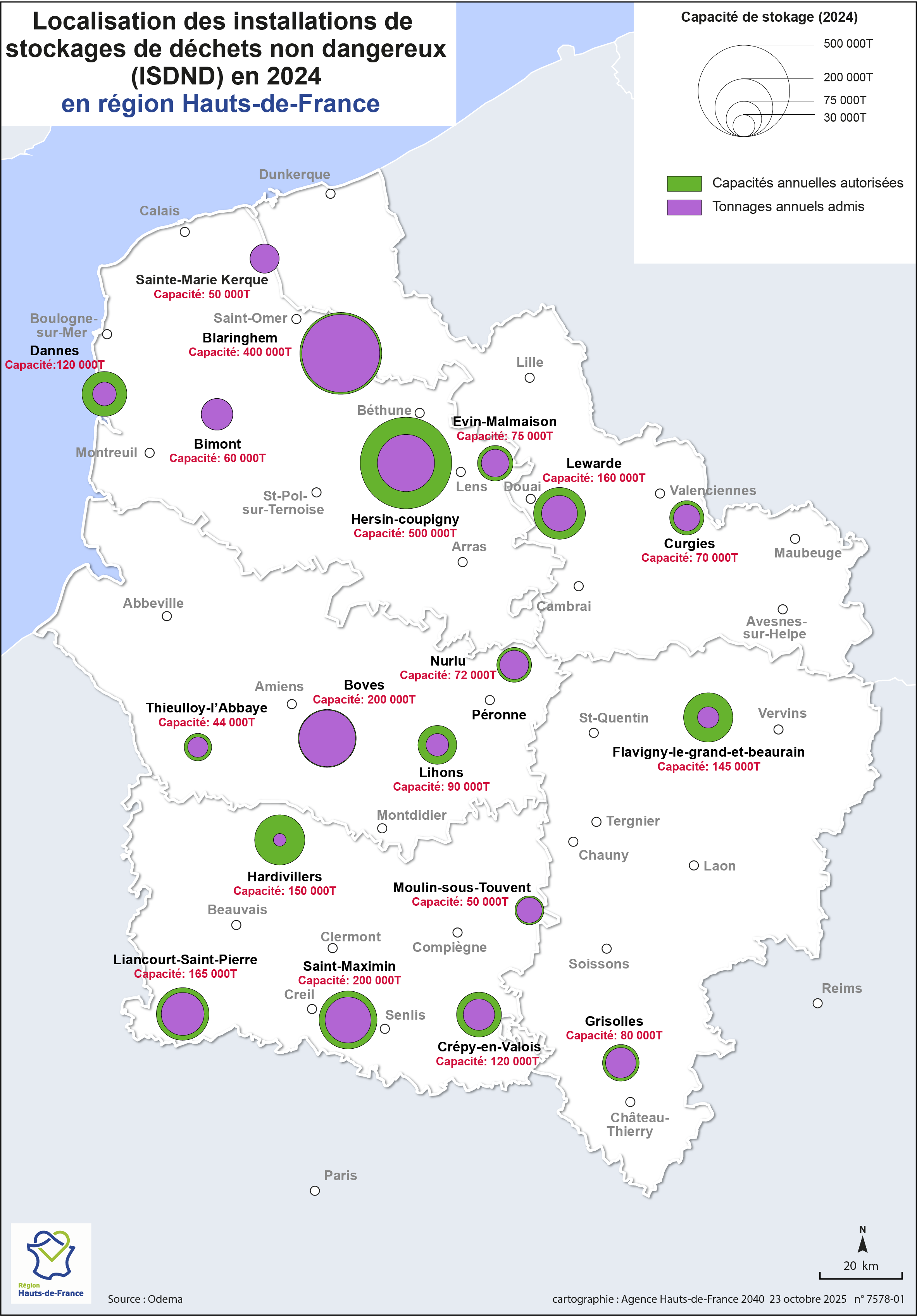 Localisation des installations de stockages de déchets avec leur capacité annuelle autorisée et tonnage annuel admis en 2024