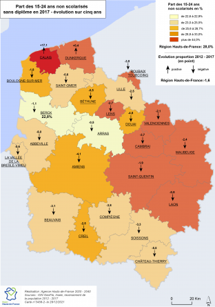 Part des 15 - 24 ans non scolarisés sans diplôme en 2017 - évolution sur cinq ans