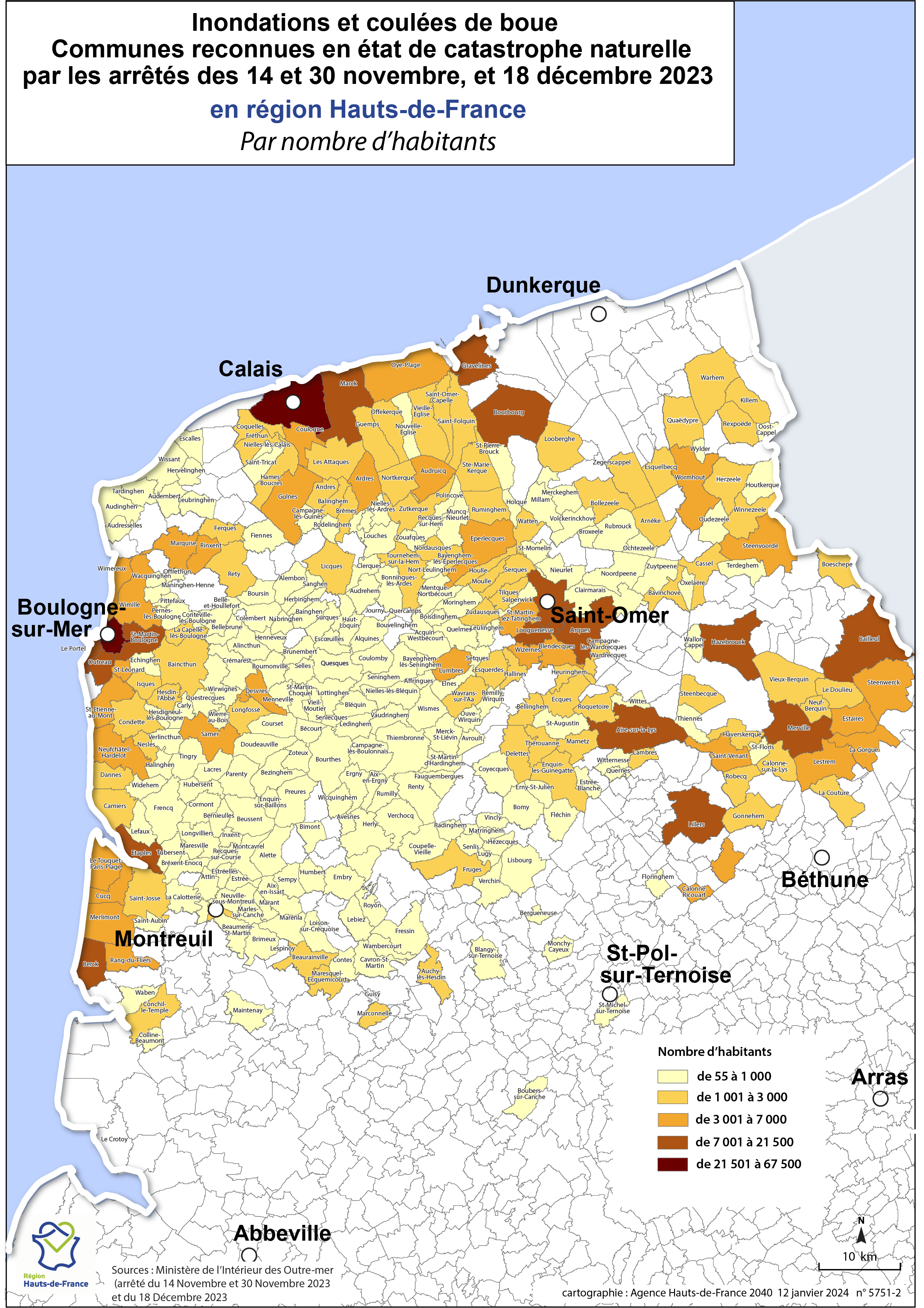 Inondations et coulées de boue - Communes reconnues en état de catastrophe naturelle par les arrêtés des 14 et 30 novembre, et 18 décembre 2023 en région Hauts-de-France - Par nombre d'habitants