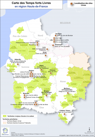 Localisation des sites Livres subventionnés par la Région ainsi que les territoires à enjeux d’accès à la culture
