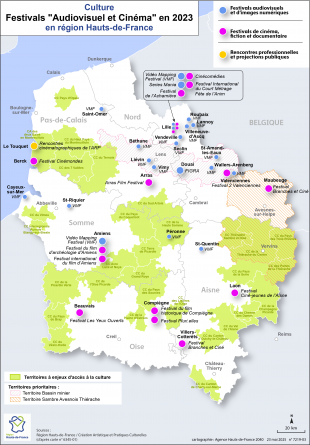 Localisation des festivals audiovisuels et d'images numériques, des festivals de cinéma, de fiction et documentaire et des rencontres professionnelles et projections publiques subventionnés par la Région ainsi que les territoires à enjeux d’accès à la culture