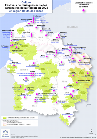 Localisation des sites et festivals de musiques actuelles partenaires de la Région ainsi que les territoires à enjeux d’accès à la culture
