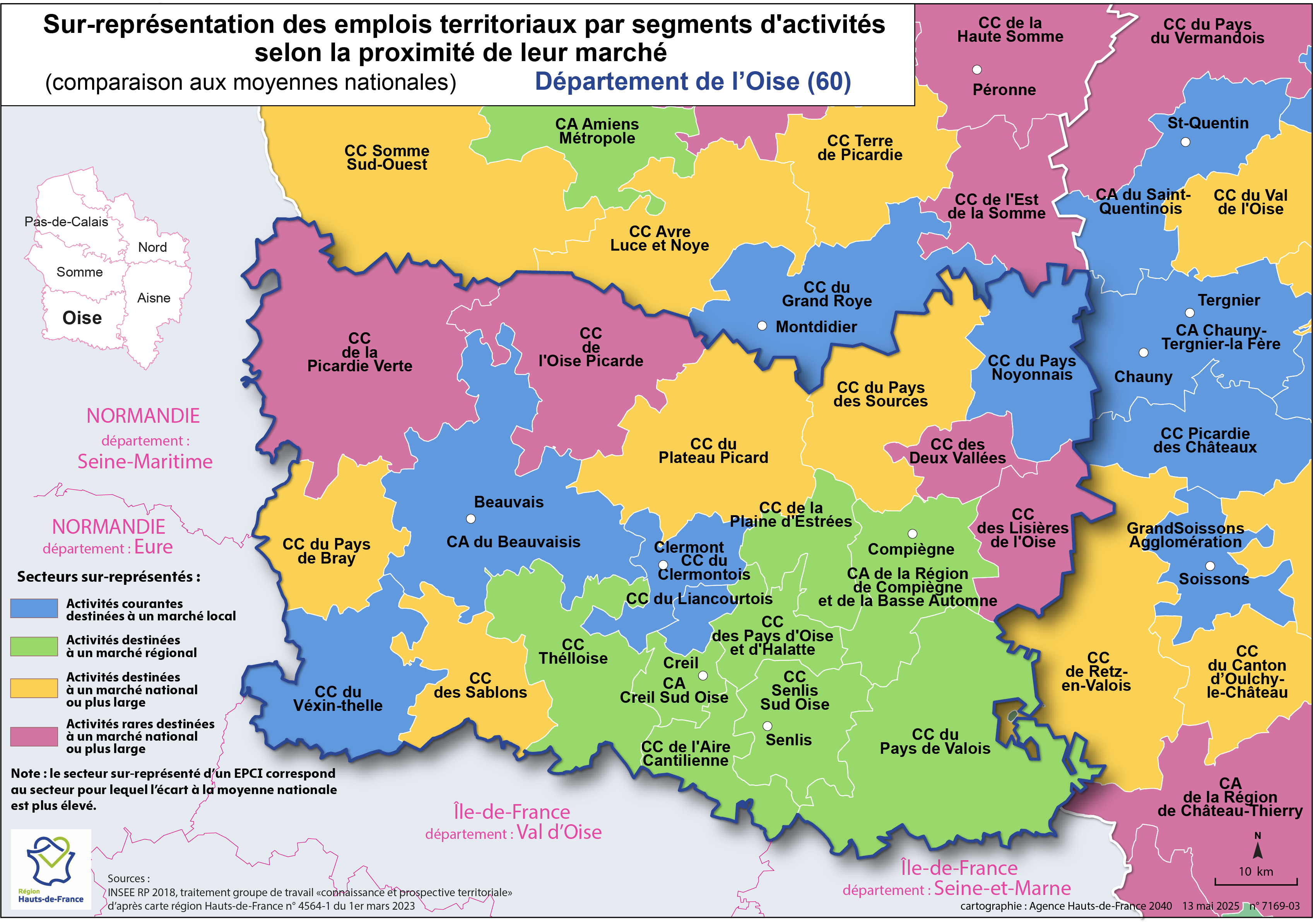 Sur-représentation des emplois territoriaux par segments d'activités selon la proximité de leur marché - Département de l'Oise (60)