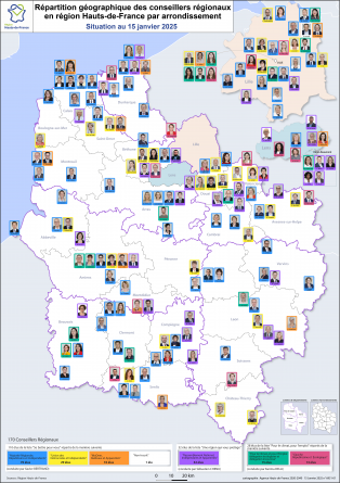 Répartition géographique des conseillers régionaux en région Hauts-de-France par arrondissement - Situation au 15 janvier 2025