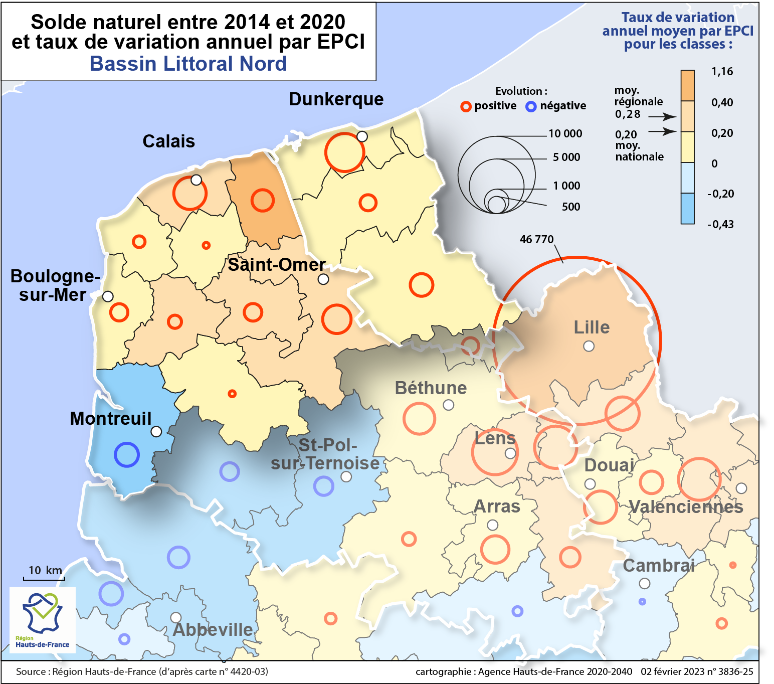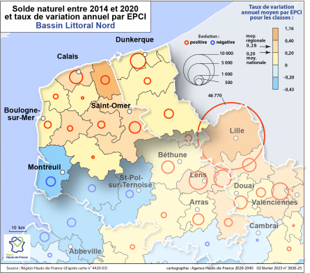 Solde naturel entre 2014 et 2020 et taux de variation annuel par EPCI Bassin Littoral Nord