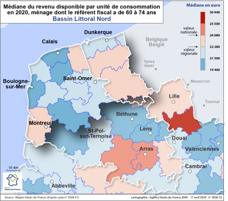 Médiane du revenu disponible par unité de consommation en 2020, ménage dont le référent fiscal a de 60 à 74 ans Bassin Littoral Nord