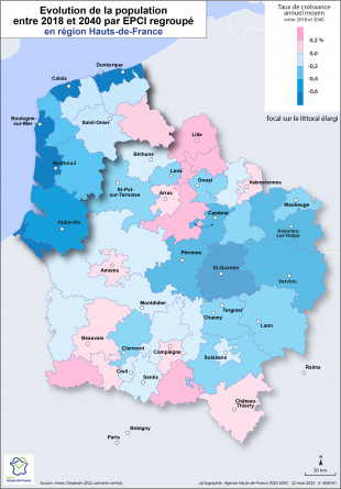 Evolution de la population entre 2018 et 2040 par EPCI regroupé en région Hauts-de-France