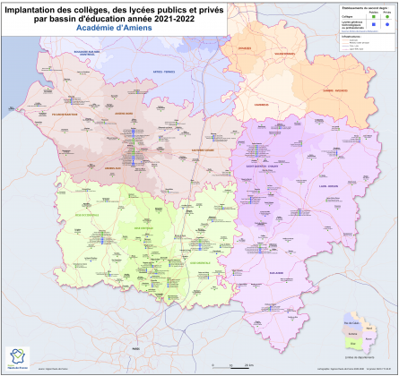 Implantation des collèges, des lycées publics et privés par bassin d'éducation année 2021-2022 - Académie d'Amiens