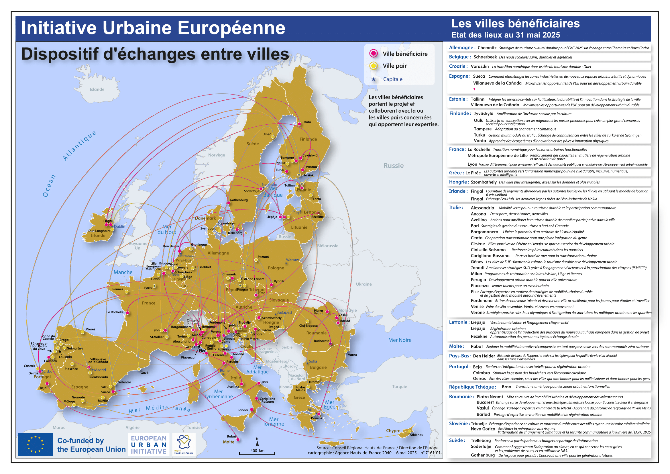 Localisation des villes européennes concernées par le projet "Initiative Urbaine Européenne" avec les villes bénéficiaires portant le projet et collaborant avec la ou les villes pairs concernées qui apportent leur expertise.