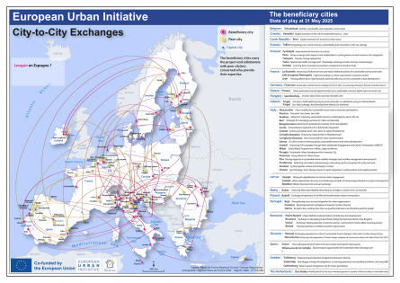 Localisation des villes européennes concernées par le projet "Initiative Urbaine Européenne" avec les villes bénéficiaires portant le projet et collaborant avec la ou les villes pairs concernées qui apportent leur expertise.
