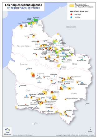 Cette carte représente la localisation des sites SEVESO (seuil haut et seuil bas) en 2024 et les communes ayant un Plan de Prévention des Risques Technologiques